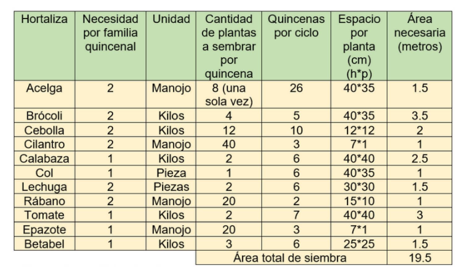 cultivar dentro del Huerto Familiar y las cantidades necesarias para el