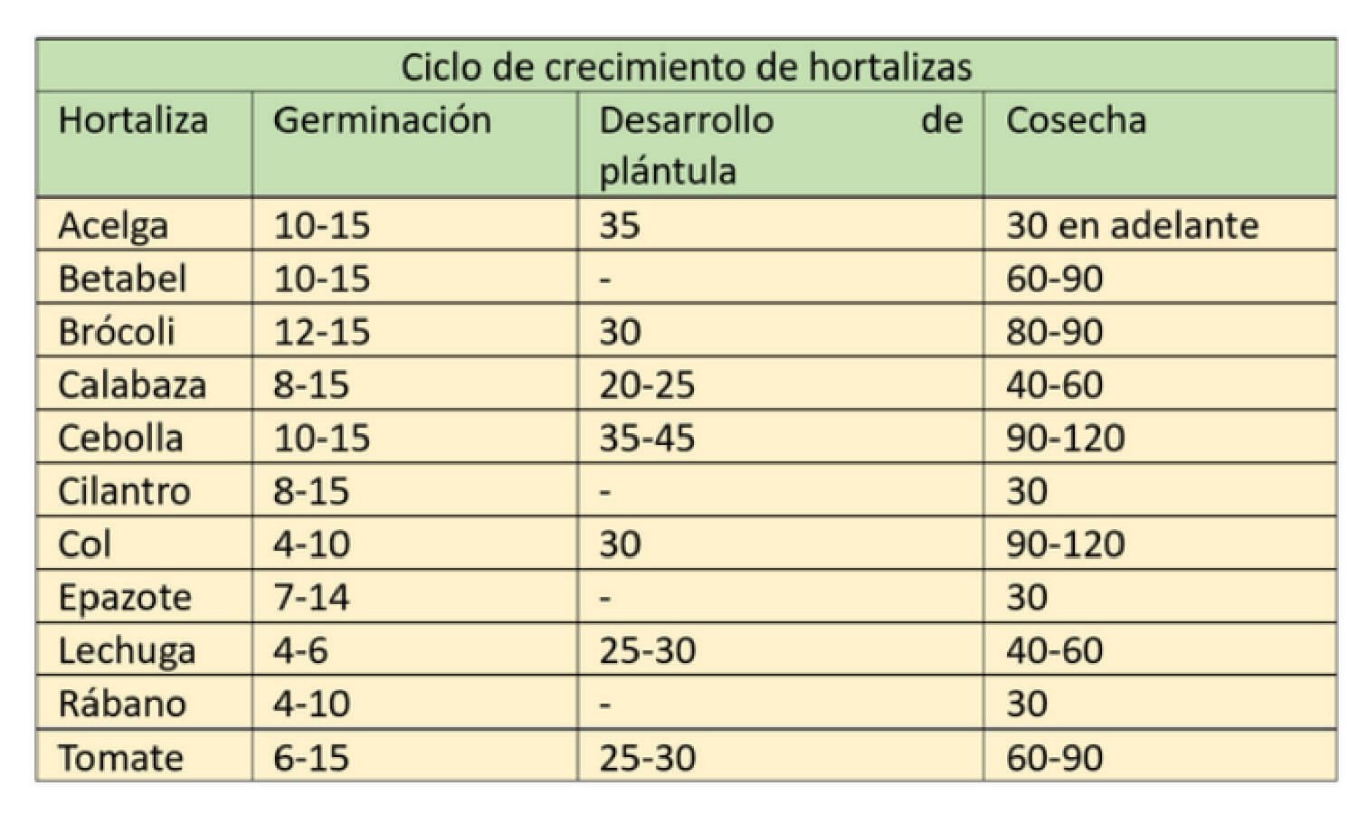 Acelga, Brócoli, Cebolla, Cilantro, Calabaza, Col, Lechuga, Rábano,